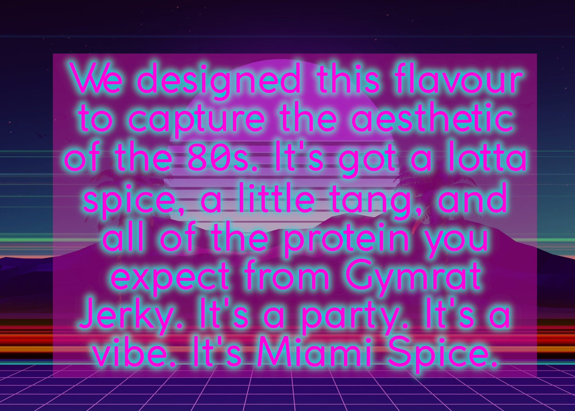 Catch an 80s bodybuilding flow with our retro Miami Spice flavour. Inspired by Latin American cuisine, this jerky leads with a flaming punch before being followed by tangy sweetness.
